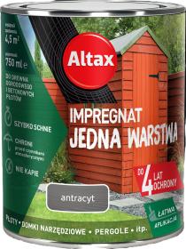 Antracyt_0.75LAltax Impregnat JEDNA WARSTWA ANTRACYT 0,75LAltax Impregnat JEDNA WARSTWA PIASKOWIEC 0,75L to kolor, który przyciąga wzrok i nadaje pomalowanej powierzchni atrakcyjny wygląd. Impregnat Jedna Warstwa to nowoczesny produkt przeznaczony do zabezpieczenia nowych i starych elementów z drewna lub betonu na zewnątrz przed niszczącym wpływem czynników atmosferycznych do 4 lat. Impregnat zawiera system wosków, który wypiera wodę oraz tworzy elastyczną, niepękającą i niełuszczącą się powłokę zapewniając pełną ochronę drewna na zewnątrz. Impregnat Jedna Warstwa nadaje się do impregnowania budy dla psów, drewnianych altanek, domków drewnianych, drewutni, donic, palisady, pergoli, płotów lamelowych, sztachet oraz innych powierzchni takich jak betonowe ogrodzenia. Jeżeli drewno nie było wcześniej zabezpieczone przed grzybami, pleśniami i owadami to należy przed malowaniem zastosować impregnat gruntujący Altax. Altax Impregnat JEDNA WARSTWA nie jest przeznaczony do impregnowana drewna gładkiego, mebli drewnianych i tarasów.